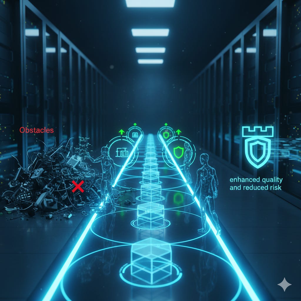 CD systematically removes obstacles that prevent code from reaching production — manual handoffs, long queues, environment bottlenecks — and replaces them with automated validations that catch quality issues as early as possible. Each failure reveals systemic causes, which we address by adding better guardrails, making the system learn and improve over time. The goal is enhanced quality and reduced risk. Speed is a side effect: the same small batches and fast feedback loops that improve quality also happen to make delivery faster.