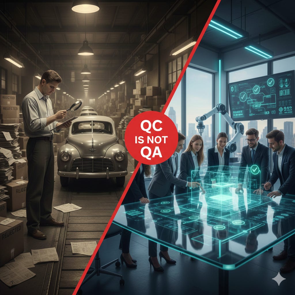 Here’s the difference. QC asks, “Does this output meet the specification?” QA asks, “Why did this defect get created in the first place, and how do we prevent this class of defects from ever happening again?” QC is Ford in 1958 averaging quality scores across cars rolling off the assembly line and shipping anything that hit the minimum. QA is Toyota stopping the line to fix the process that allowed the defect.